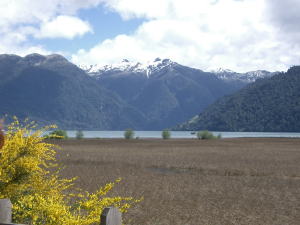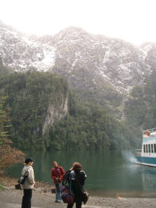 | 国境の山道を降りていくと,また道端に小屋がある。今度はチリの国境事務所だ。 別のトラックで運ばれた我々の荷物はすでに通関検査台に並べられている。 やっぱり・・・,最も怪しそうな形のUsazitoのバッグを開けろという。 どうも,暇な山小屋税関吏の興味を惹いただけの気がする。問題なく終わる。 すぐ近くに,このルートで唯一のチリのホテルがあり,ここで昼食休憩となる。 冬の間,このルートは二日掛りの行程となり,その時はここが宿泊場所になるらしい。 しかしこのルートは雪があるときは,大変だろうなあと思う。 昼食を終えしばらく周囲の散策をしたのち,最後の船に乗り,トドスロスサントス湖に乗り出す。 |