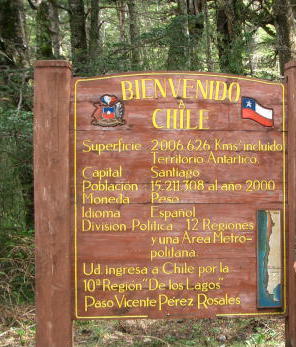 | 二つめの静かな湖を渡った岸辺に,ぽつんと 平屋の小屋がある。 アルゼンチンの国境事務所だ。 ここで出国スタンプをもらい,チリのお金に両替。 熱いコーヒーで一息いれる。 このツアーは,船,バスと何回も乗り換えるが 荷物は全て積み替えてくれるので,心配は無い。 ここから3番目のバスに乗り山を越えていくと, 途中の山中に本当の国境がある。(下の写真) |