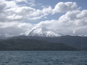 【 ルートの最後は,大きな湖ジャンキウエの岸を走るバス】 ”チリ富士”といわれるオソルノ山頂には雲。 |