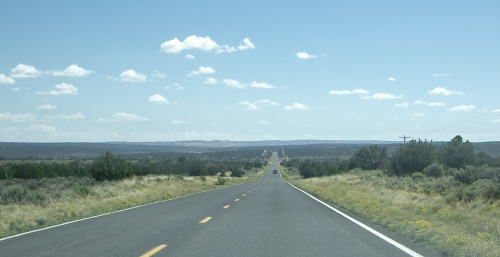 | Canyon de Chellyの谷底ツアーを楽しんでから出発。また静かな191号線を 南下する。しばらくは赤茶けた岩山やわずかに潅木の生えた荒野っぽい景色だが, Ganadoを過ぎると周囲の景色は緑を増し,山越えの雰囲気となる。 とは言ってもここはアメリカ西部,道はあくまでも真っすぐ。遥か前方を幾重にも横切る山脈を突 っ切って行く。まるで壮大な波乗り道路,爽快で面白い走りだ。 |