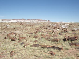 | 何処かに宿を探して,明日見に来よう。 またI-40号線にのり25kmほど走った街,Holbrook でHoliday Innを見つけて今日は泊り。 2億年以上前!に土砂や火山灰に倒れ埋まった大木に,珪素(シリカ)を含んだ水が染込み 長い年月をかけて,木そのものが石化(鉱石化)していった。その後の地殻変動や洪水によって 地表に現れたのが,今のここの姿である。(日本語では”珪化木”) 広いエリアの中を,順路が通してあり幾つかのポイントから眺める。 |