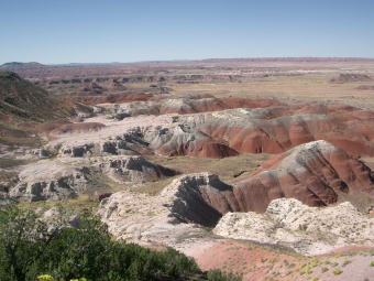 ここからは西に向かう。30分ほどで”化石の森・国立公園”の入口に着いた。 入口付近は,"Painted Desert"と名付けられた開けた見晴らし。”カラフルな砂漠”なのだが, 今回巡って来たダイナミックな谷や景色の感動の後ではイマイチだ。 |